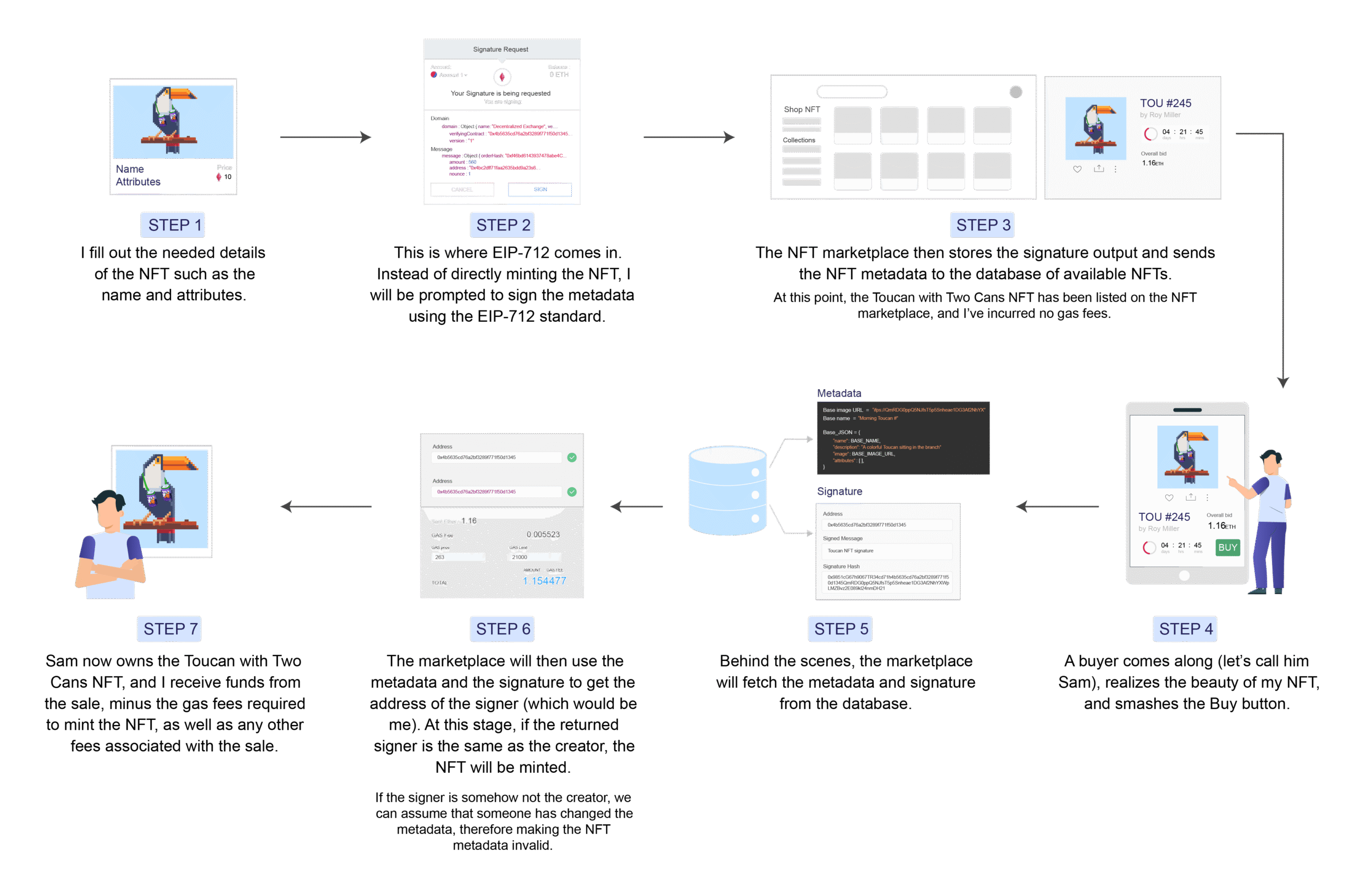 Step 3: The NFT marketplace then stores the signature output and sends the NFT metadata to the database of available NFTs.