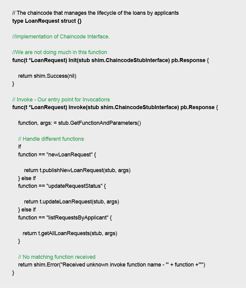 All chaincodes must implement the “Chaincode” interface. This interface provides two key functions, Init and Invoke.