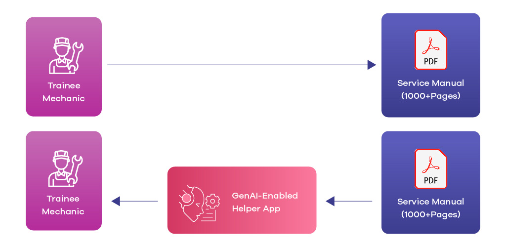 Mechanics often face the challenge of navigating through extensive manuals to find troubleshooting information, which can be tedious and time-consuming. This application simplifies the process by enabling the chatbot to access and interpret the unstructured data of the manual.